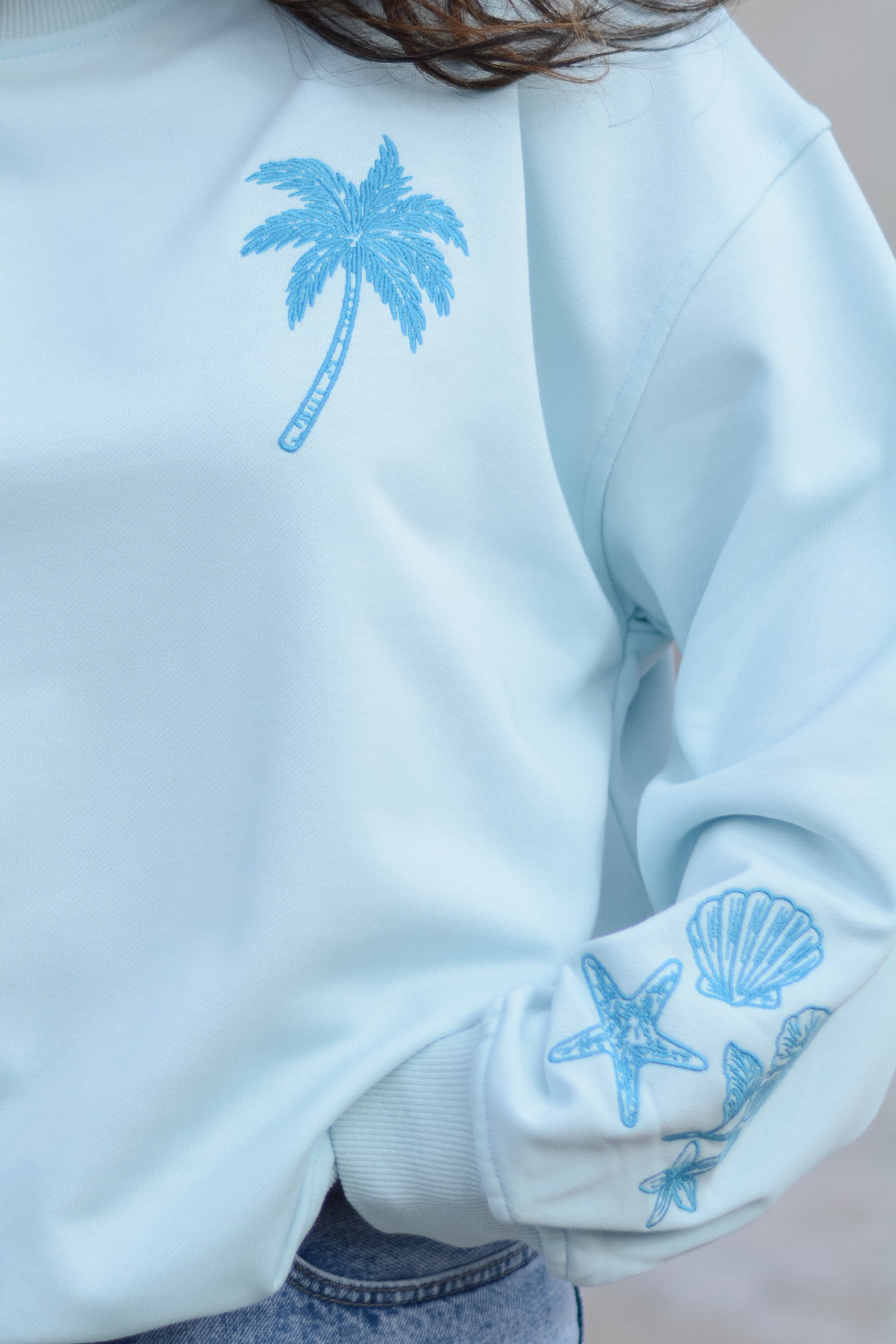Pale Blue Crewneck Long sleeve with beach stitched graphics